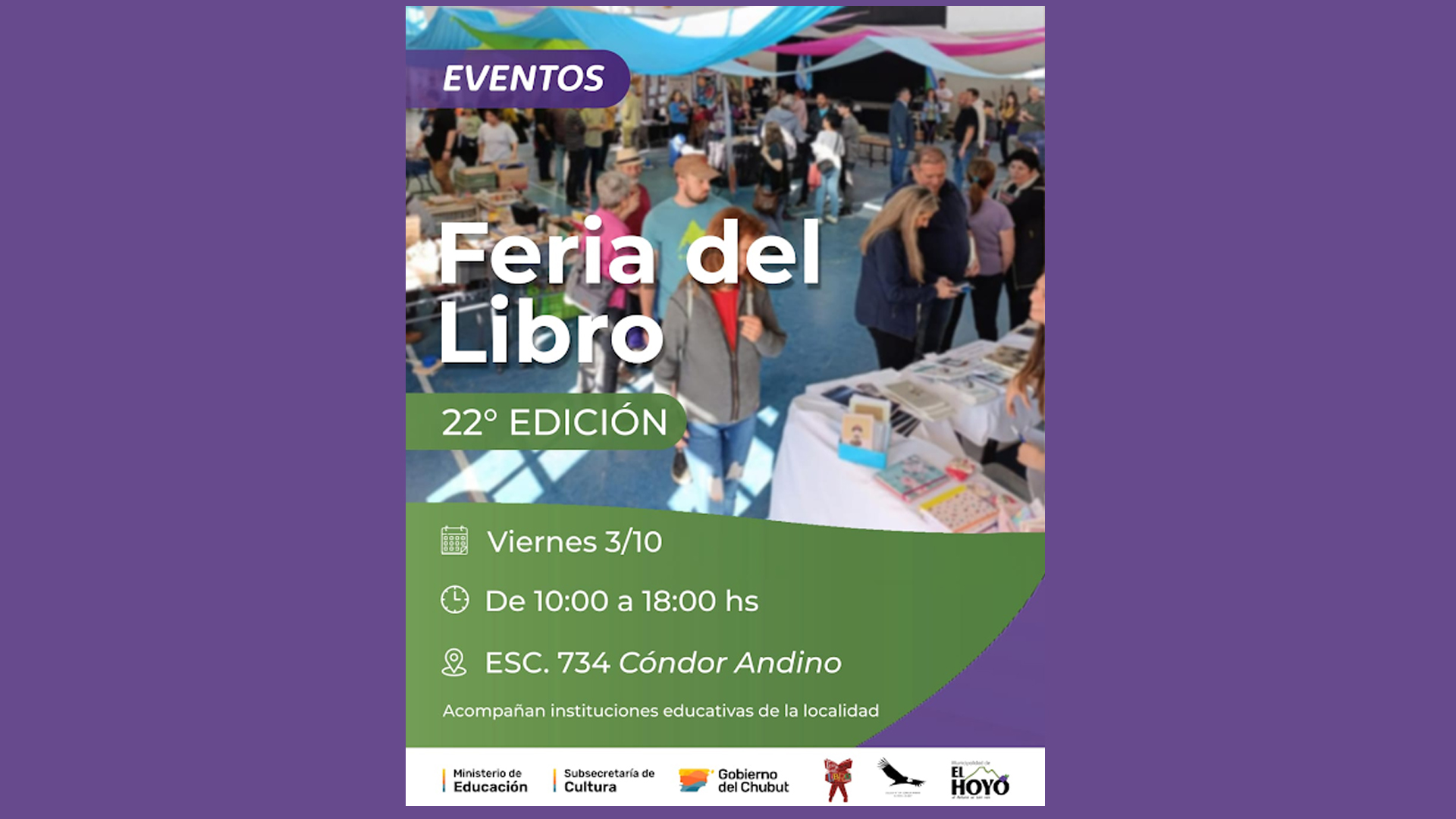 Este viernes 3 de octubre, desde las 10 hasta las 18 horas, la Escuela 734 “Cóndor Andino” de El Hoyo realizará la 22° edición de la Feria del Libro en el SUM de la institución.